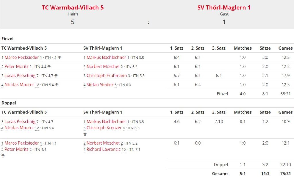 Das Spiel gegen TC Warmbad-Villach ging am Sonntag leider mit 5:1 verloren. Stefan Siedler gab sein Meisterschaftsdebüt, musste jedoch trotz guter Leistung eine Niederlage einstecken.